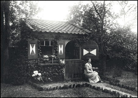 ‘In haar nieuwe huis had ze dan wel de zo lang gewenste eigen kamer, een ideale ruimte was het niet. Als Wim spreekuur hield – en dat was vaak ook op zondagmorgen – , rinkelde geregeld de voordeurbel. De patiënten posteerden zich vervolgens in de hal, de ‘wachtkamer’, en brachten met hun luidkeelse conversatie, waarbij sommige ongetwijfeld bloemrijk over hun kwalen vertelden, onrust in huis. Daarbij gaf Wim nog medische cursussen aan huis. Een oud stenen kolenschuurtje in de tuin bracht uitkomst. Het hok van twee bij twee meter werd verbouwd tot een werkruimte voor Top, met romantische luikjes ervoor en geraniumpotjes voor de raampjes. Op een foto poseert Top Naeff ervoor als een juffrouw bij een voortijdige Eftelingattractie.