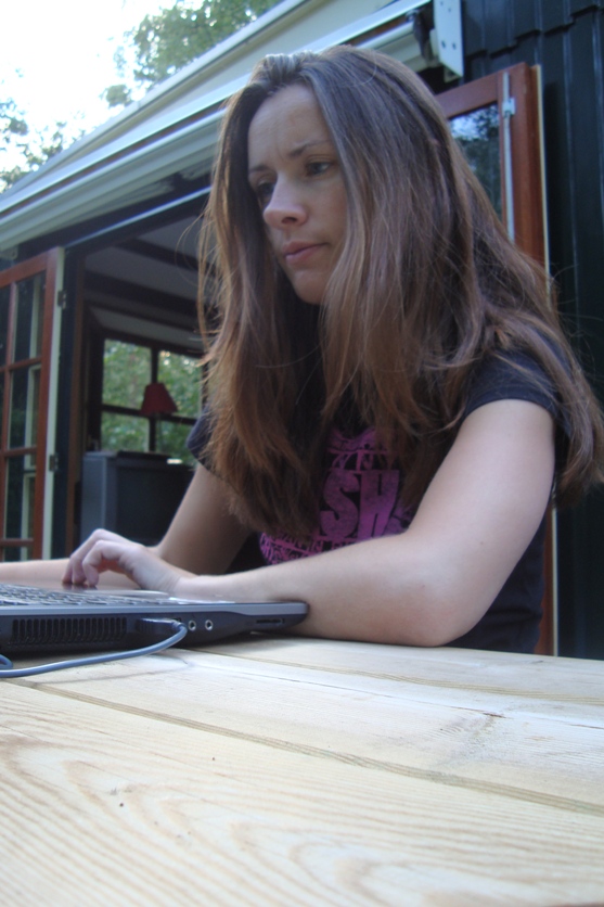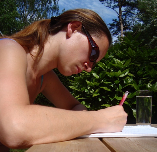 Aan de picknicktafel. Overdag in bikini. Op een collegeblok van de Bas. Met een roze pen. En gemiddeld vier kinderen die de tuin in en uit lopen. Maar dat zou morgen weer heel anders kunnen zijn, afhankelijk van het weer, beschikbaar papier, is de pen nog terug te vinden, en de kinderen.