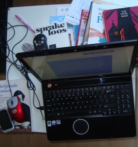 Als de kinderen hier een weekend geweest zijn (dit verhaal start in medias res, maar een goede lezer begrijpt dat wel), hebben alle spullen een andere plaats gekregen. Er is een voetbal verdwenen en er ligt een pak knutselpapier uitgestort op de slaapkamervloer. Op een klein IKEA-bijzettafeltje staat nu de laptop met drie snoeren eraan, maar ook een doosje kleurpotloden en een stapel boeken die je in geen enkele boekwinkel bij elkaar op een verkooptafel zou aantreffen: Schrijvende vrouwen, Floddertje, Sprakeloos, De Correcties, en (last but not least) Het klompje dat op ’t water dreef, wie kent ‘m niet. De bijzettafel doet ook dienst als krantenbak, er ligt een Allerhande en de Tros Kompas die hier altijd verkeerd bezorgd wordt en ik ben wel bang voor deurwaarders die op een dag mijn inboedel komen halen omdat ik mijn lidmaatschap van de Tros niet heb betaald. Maar het staat ook niet op mijn naam, ik heb nergens om gevraagd, ik vraag nooit ergens om. Er liggen ook nog wat kleine klusjes op de tafel, een verzoek om commentaar te geven op de eerste versie van een lesboek, er ligt een notitieblok dat altijd vraagt om briljante ingevingen en het laatste nieuwe hoofdstuk voor mijn eerste boek en m’n telefoon ligt er, m’n lifeline naar de rest van de wereld. Kortom, dit is nu mijn bureau, ik heb ook andere plekken die ik als bureau gebruik, de eettafel, de bar, ja ik heb een bar in mijn huis, maar wat ik wilde zeggen is: de dingen hebben hier geen vaste plek. Ik woon er nog niet zo lang.