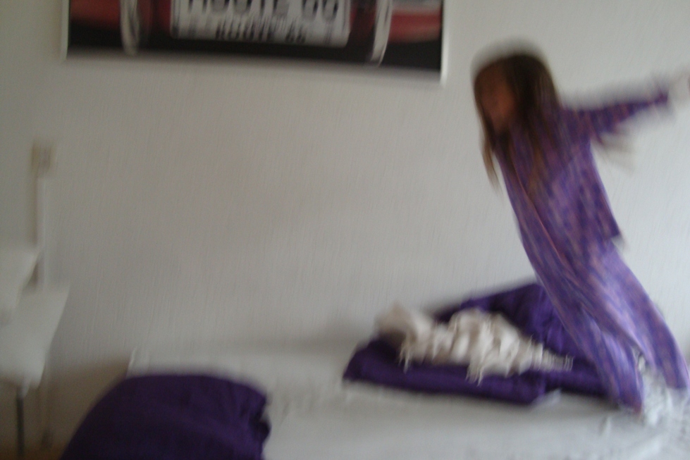 Nu zou ik mijn kinderen toch verkeerd begrijpen als ik in deze reeks artistieke foto’s de mooiste wil aanwijzen, het is een serie. Maar dit is mijn favoriet, uit de reeks ‘de stervende zwaan’ (51 foto’s): het lef om de zwaartekracht aan de laars te lappen, die beweging, geen voeten, geen handen, het lichaam in een schuine hoek, dat bed zo horizontaal, en de broer die 51 keer klikt terwijl zij dit opnieuw en opnieuw doet.