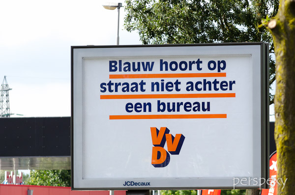 Beste VVD-postermakers, hadden jullie niet beter een komma kunnen zetten tussen ‘straat’ en ‘niet’? Nu zie ik steeds een agent voor me die zijn bureautje midden op straat heeft gezet met bureaustoel, laptop, leeslamp en wachtruimte erbij, zodat hij daar zijn bureauwerk kan doen. Ik vind ook dat dat niet hoort.