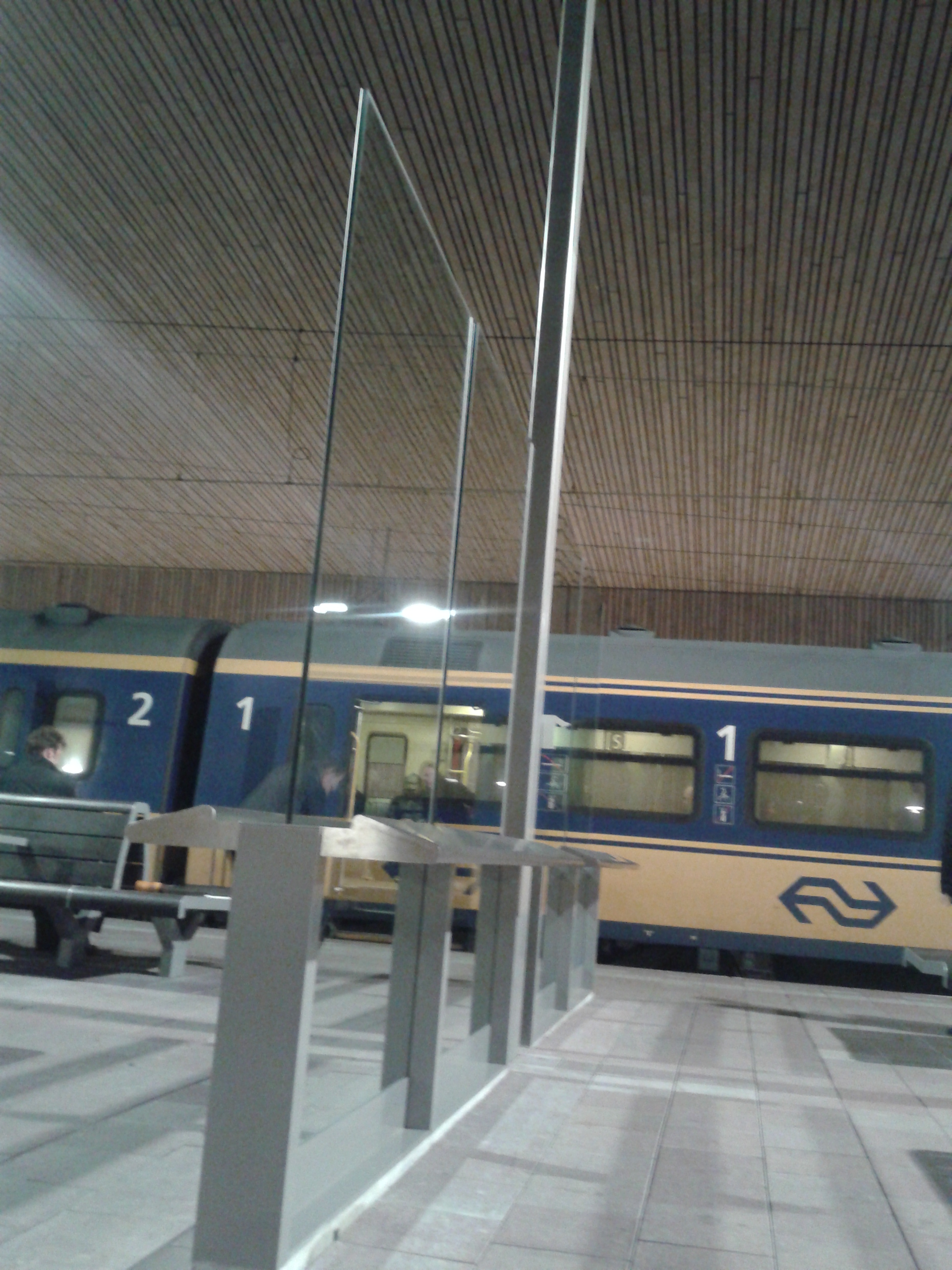 Dankzij NS-infoborden ontdek ik dat het windschermen zijn. Natuurlijk, natuurlijk! Eindelijk wordt er in deze stad, het tochtgat van Nederland, eens rekening gehouden met de wind. En terecht. Met alle wolkenkrabbers en hoogteverschillen heeft de wind vrij spel. Als je een scheet laat voor de Millenniumtoren, ontstaat er direct een tornado. Maar op dit station kun je schuilen achter glas.
