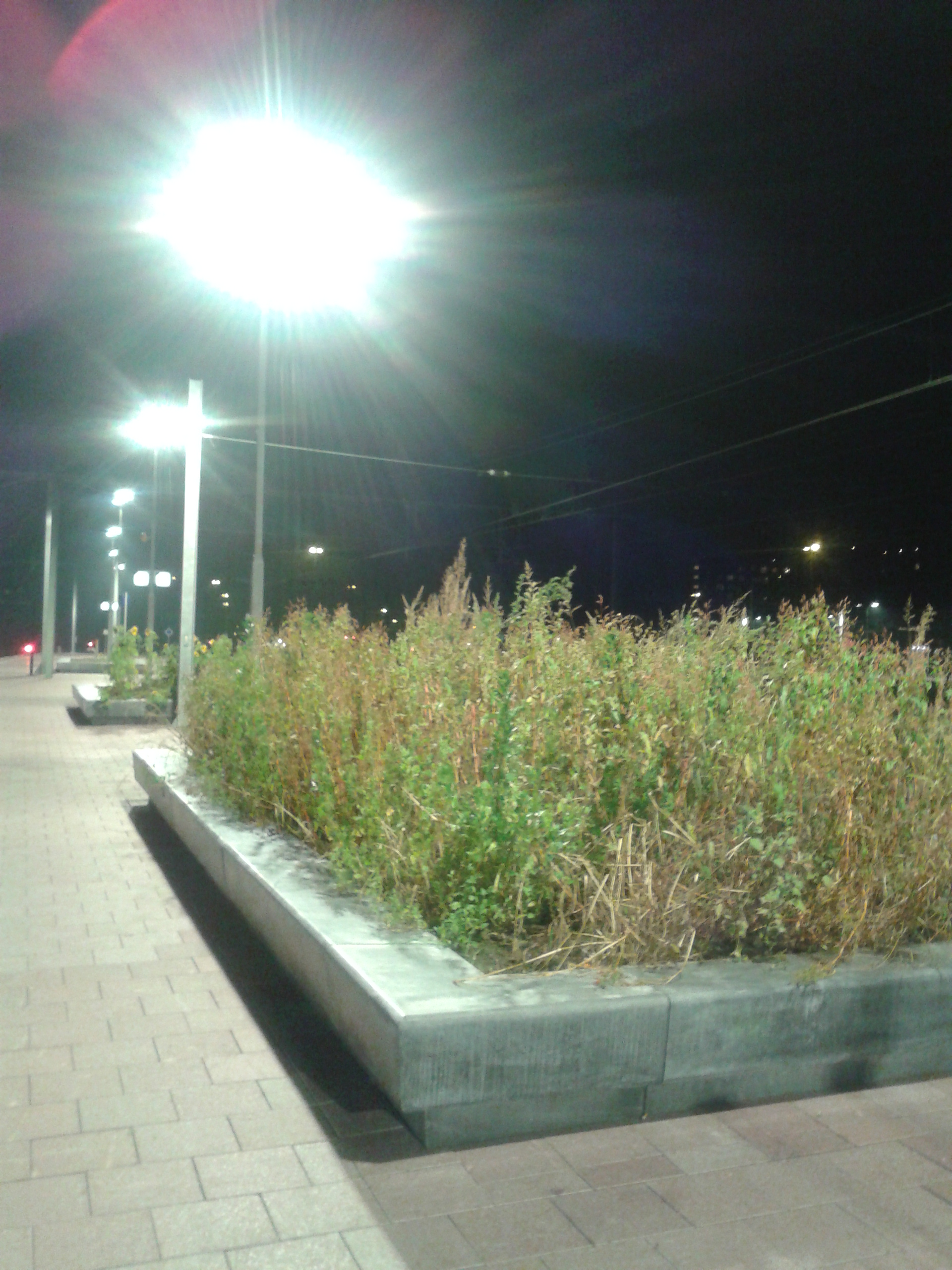 Dat is nog niet alles. Voor de echte Rotterdammer, voor het echte thuisgevoel, hebben ze nu ook slordige groene plantjes onder groot wit licht neergezet. Mooi hè. Mijn stad.