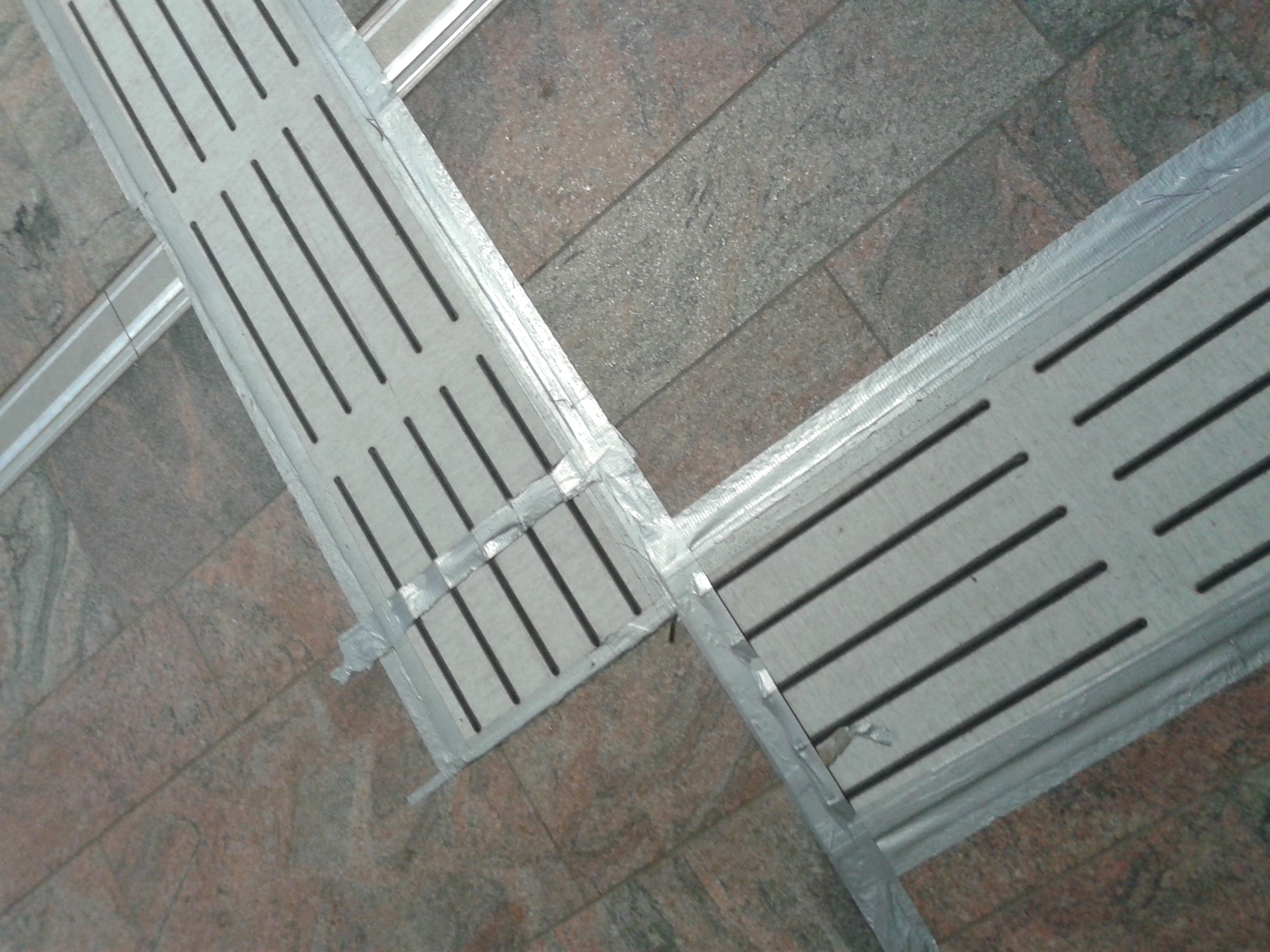 Alles is hier zo mooi uitgedacht. De strakke lijnen… glas, hout en het grijs van natuursteen, metaal en… DUCT-TAPE.