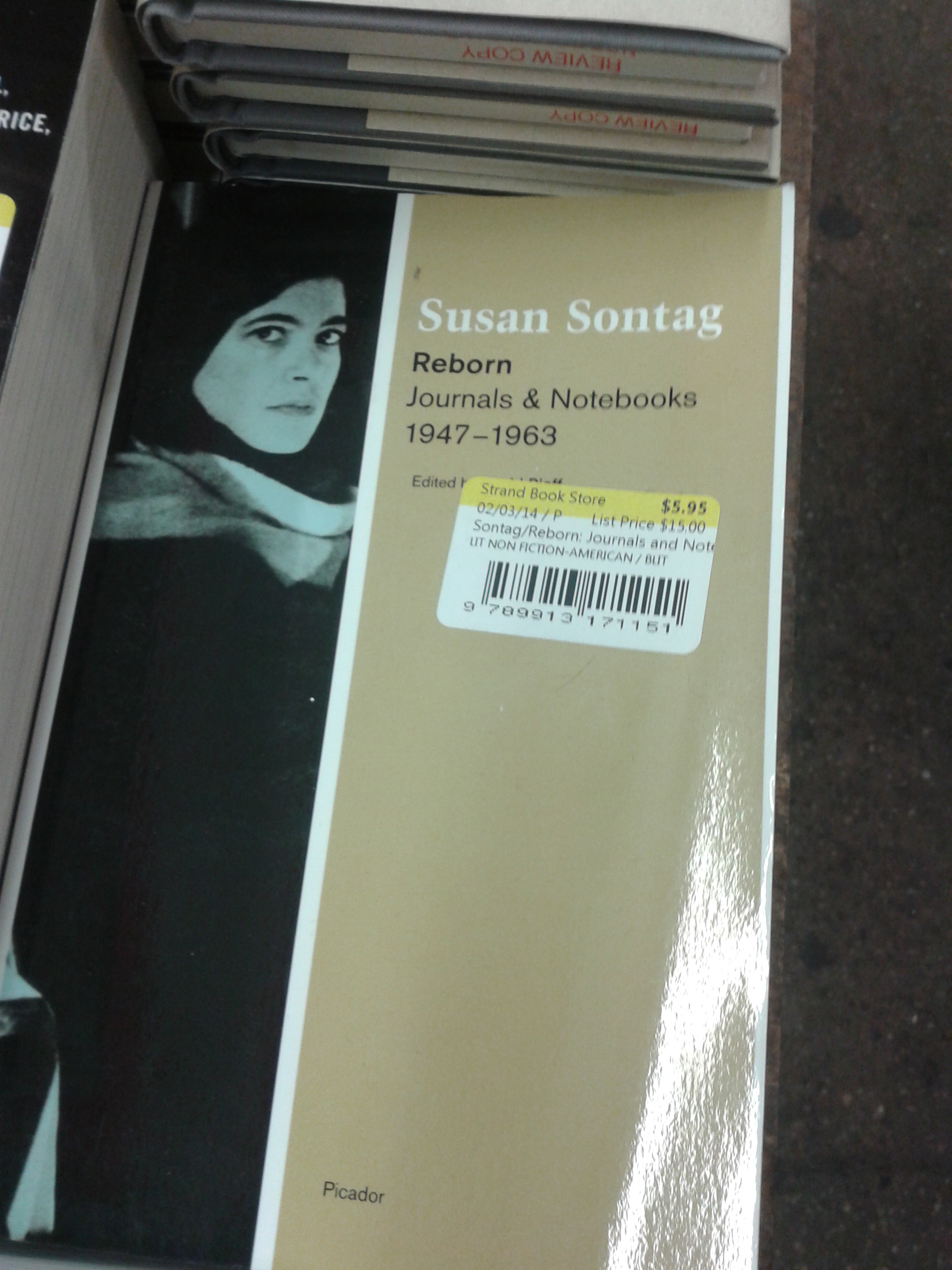 Maar nu het eerste en duidelijkste punt. Ik zag bij Strands o.a. dit boek liggen: Reborn, de dagboeken van Susan Sontag. Het boek lag er voor $ 5,95 (nieuw!). Dus in euro’s zijn de dagboeken van Susan Sontag: €4,31. En bij ons?