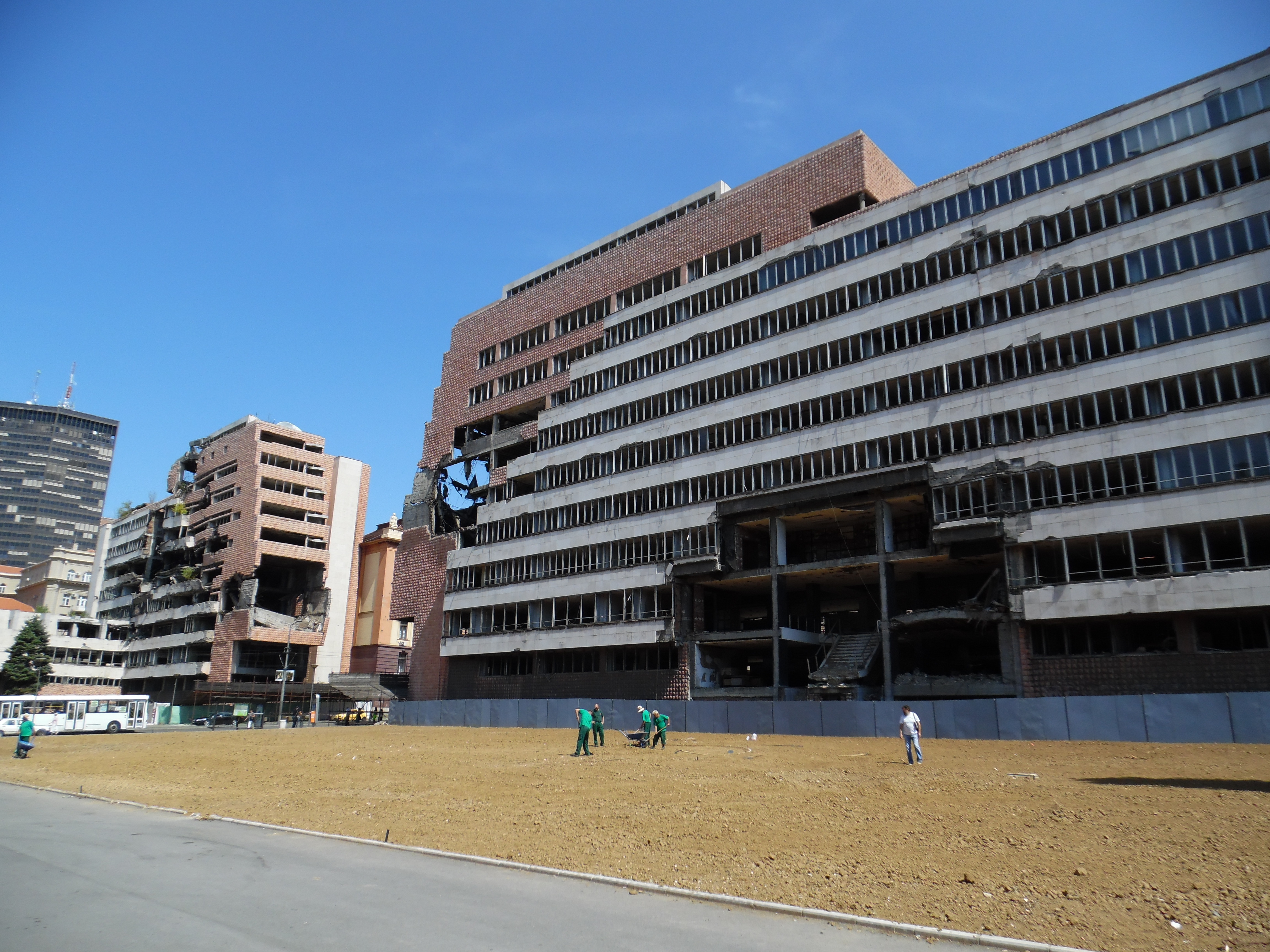 En wat is zo bijzonder aan deze locatie? Het is een niet te missen gat in de stad, het werd in 1999 gebombardeerd door de NAVO, maar men liet de gebouwen (hoofdkwartier van het leger) zo staan. In 2013 had Donald Trump plannen om van dit gebouw een hotel te maken, maar ja, Donald Trump heeft wel vaker wilde ideeën.