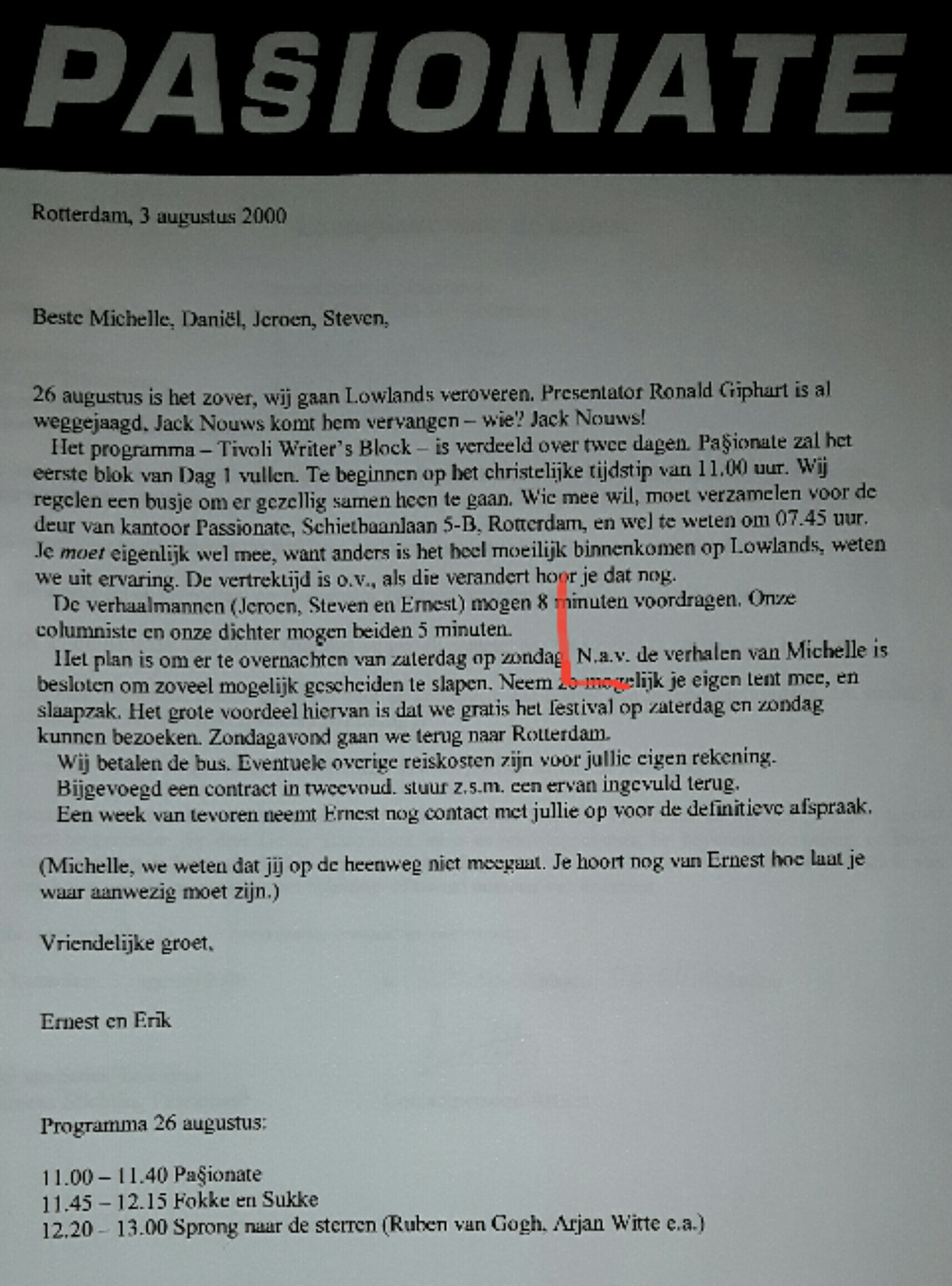 En dan kom je soms gekke dingen tegen. Hier een brief voor deelname aan een literair optreden op Lowlands (afzenders: Ernest van der Kwast en Erik Brus). Uit de hieronder toegevoegde fotokopie blijkt dat ik in 2000 een zekere reputatie had, overigens uitsluitend gebaseerd op mijn literaire werk, niet op de werkelijkheid, ik zeg het maar even: