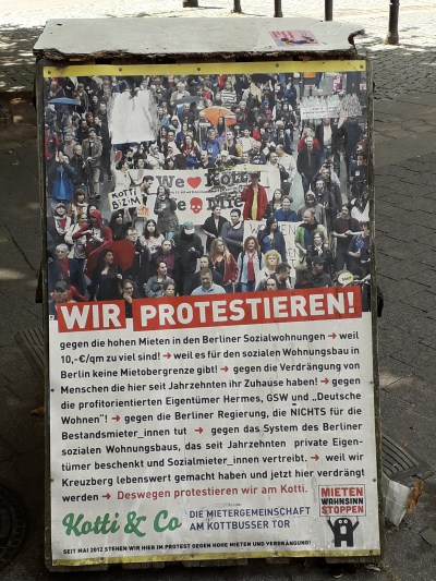 Op allerlei plekken kom ik het verzet tegen deze ‘Mietenwahnsinn’ tegen. Op affiches aan bomen, bij een protesthuisje op Kottbusser Torr (‘Kotti’), in street art. ‘Huizen zijn om in te wonen, niet voor winst’, is te lezen op de website Mietenwahnsinn.info, waar ook herinnerd wordt aan een stijgend aantal daklozen en discriminatie op de woonmarkt.
