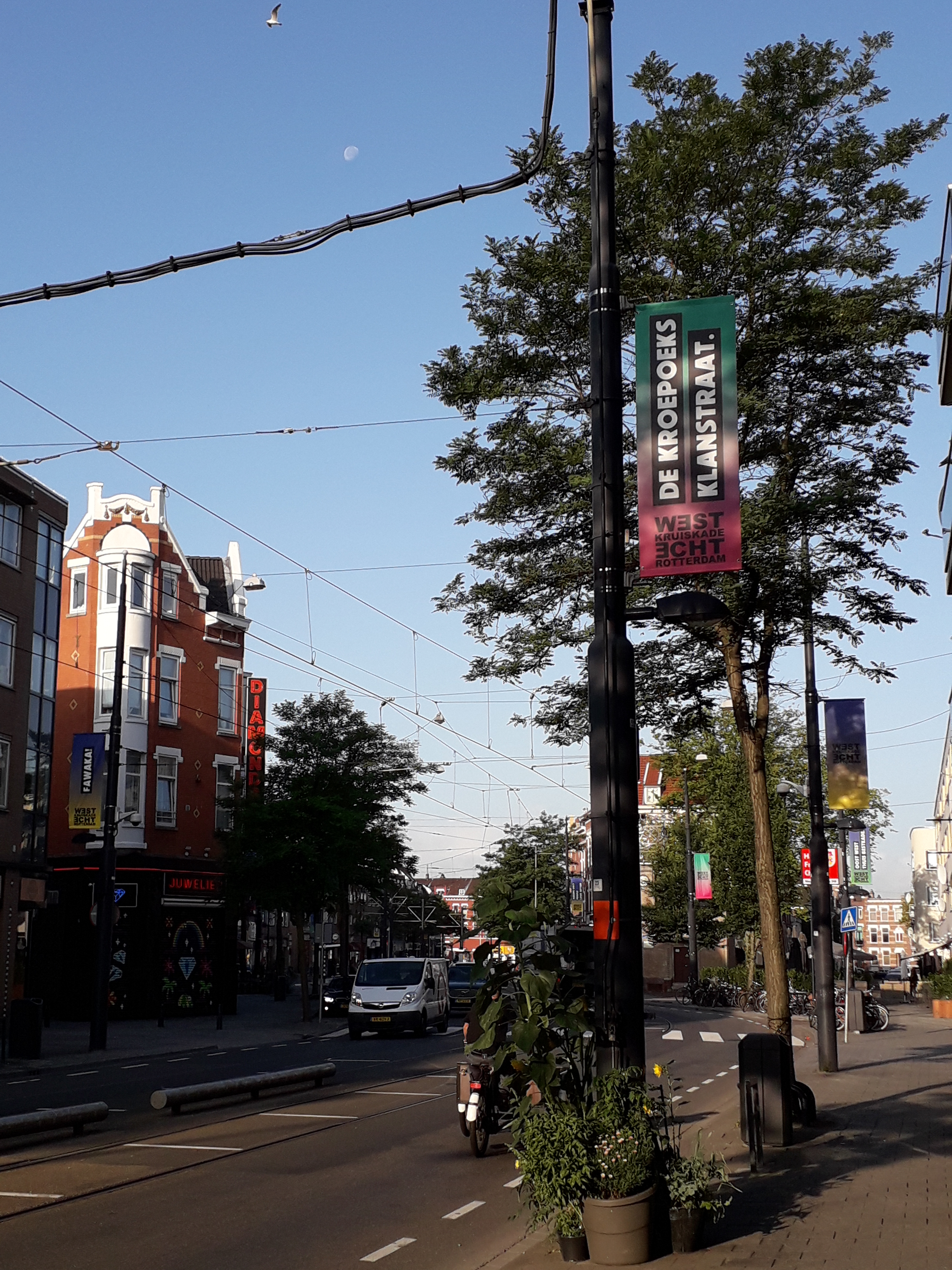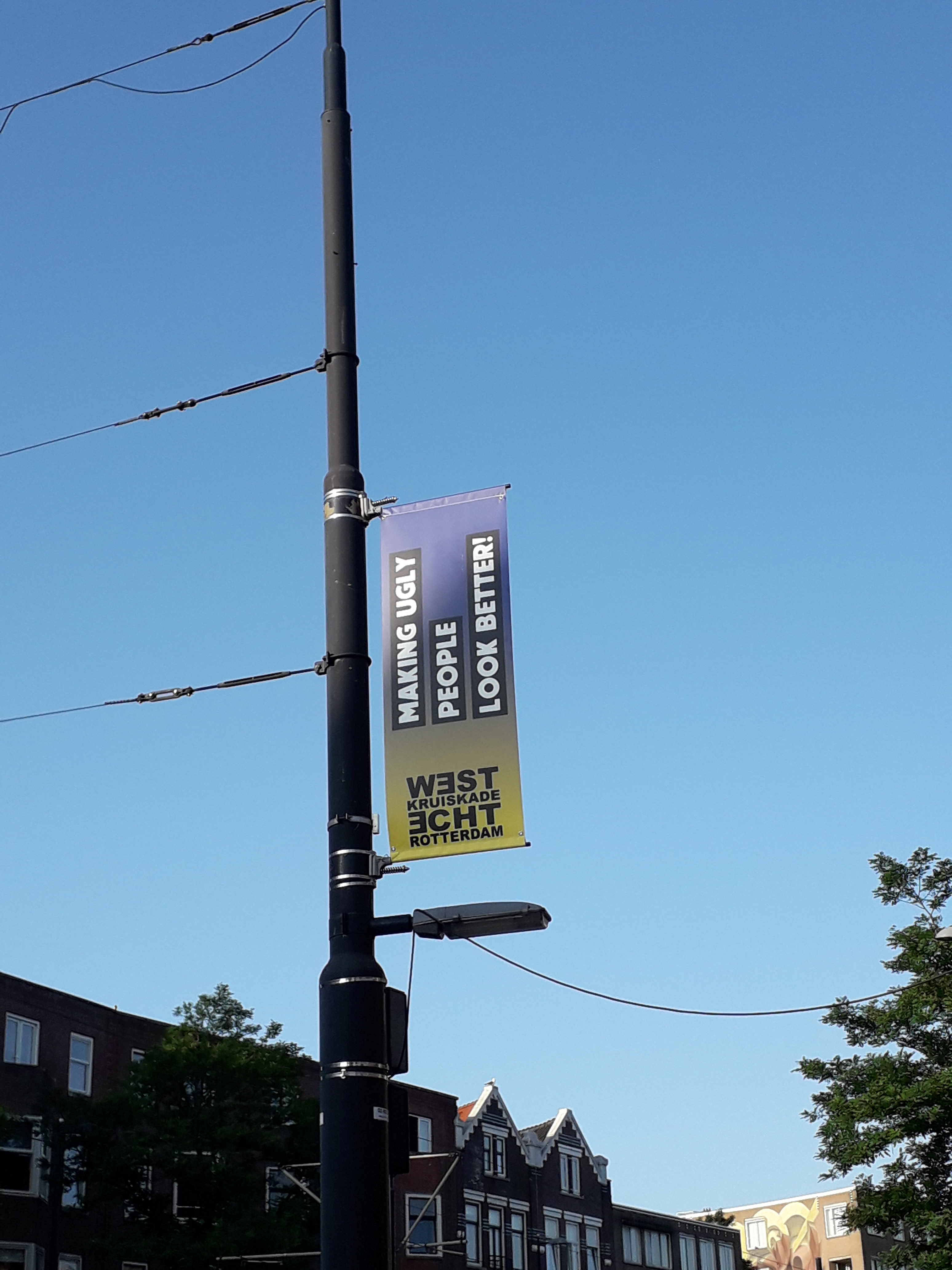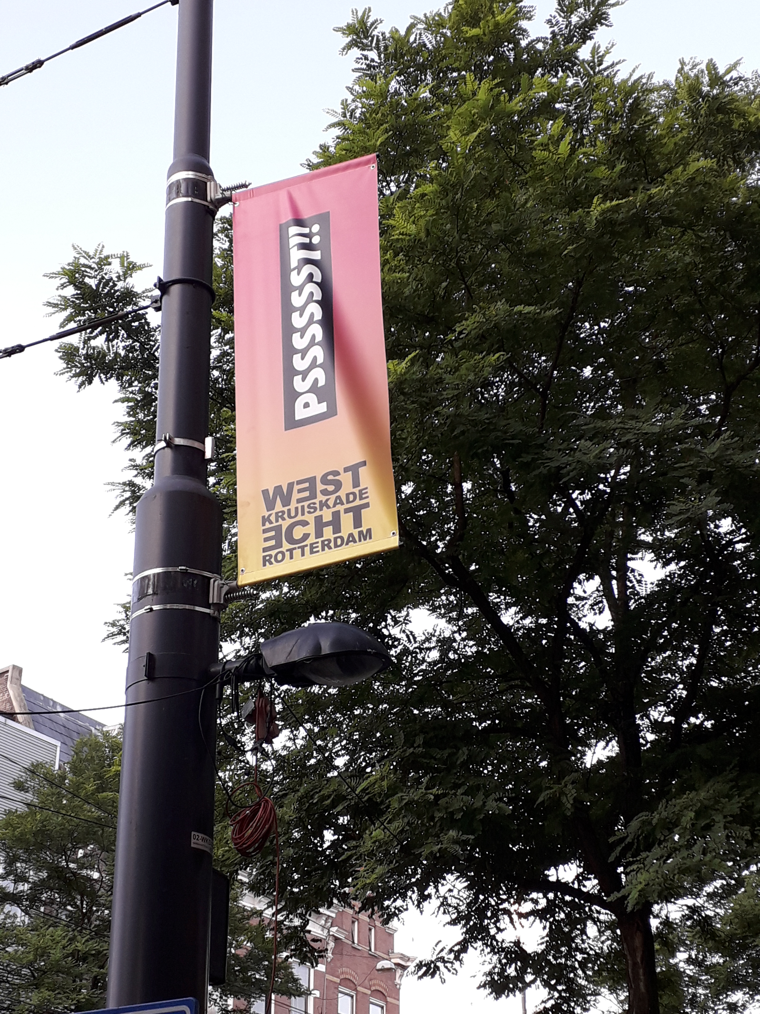Dus die vlag mag weg, ja. De rest ook? Duidelijk heeft men geprobeerd de veelzijdigheid van de West-Kruiskade te vangen in lekker veel verschillende slogans. Natuurlijk mag je ‘174-landenpunt’ een leuke naam vinden voor de plek waar inderdaad veel (winkels, mensen, producten) van onze Rotterdamse nationaliteiten en culturen terug te zien zijn. En ‘Fawaka!’ tja, zoiets op een poster zetten is toch net zoiets als wanneer een leraar dat voor de klas zegt, een politicus die een potje panna meedoet, maar vooruit.