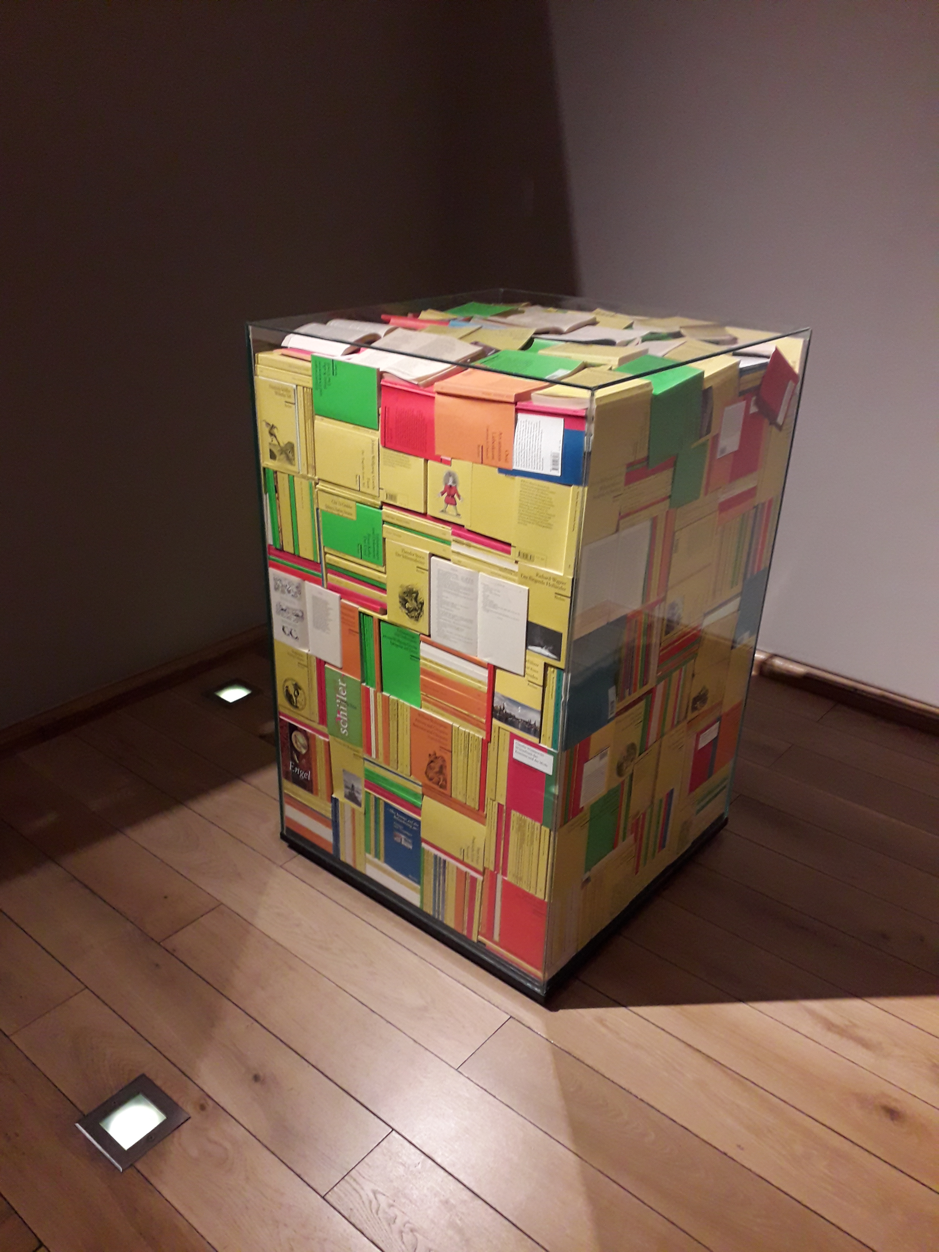 In ditzelfde hotel troffen we bij de lift een alleraardigst literair kunstwerk, een glazen bak, gevuld met hoogstaande literatuur in bekende Duitse pocketvorm. Een leuk effect: je kunt de boeken zo pakken en ze lijken er wat oneerbiedig ingepropt, zoals de onuitgepakte dozen bij de Aldi waar je gewoon maar goed moet zoeken naar het ding van jouw smaak en wie weet wat je allemaal tegenkomt, tegelijkertijd durf je dat niet te doen (want het is KUNST) en zo zijn deze pockets juist tot een hoger, onaanraakbaar niveau verheven.