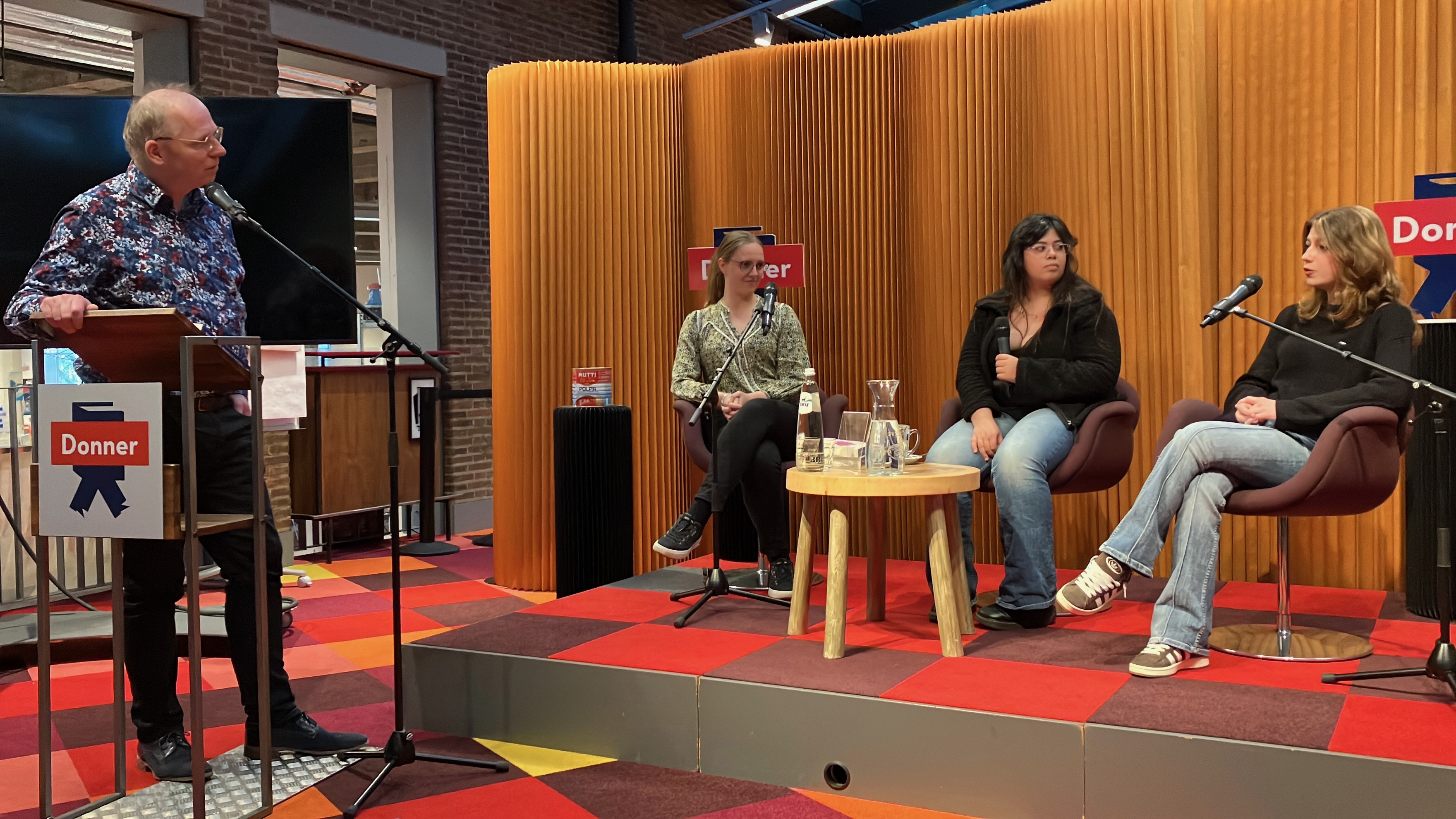Bij de boeklancering leidde Coen Peppelenbos van Uitgeverij kleine Uil ook een gesprek met een lerares klassieke talen en twee leerlingen die het boek al gelezen hadden.